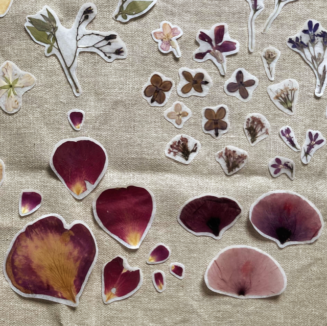 • Fleurs, pétales et feuilles collectées autour de chez moi et séchées à la maison.